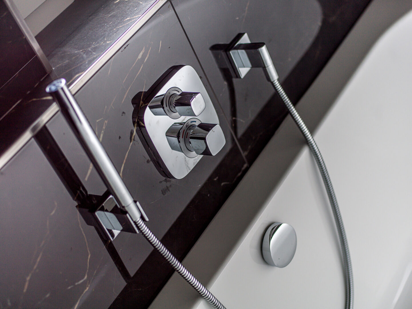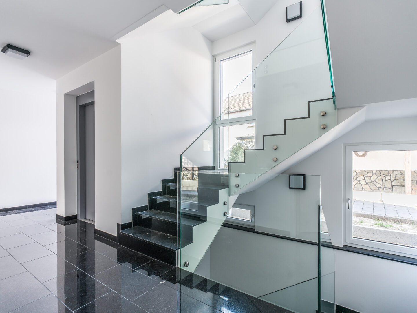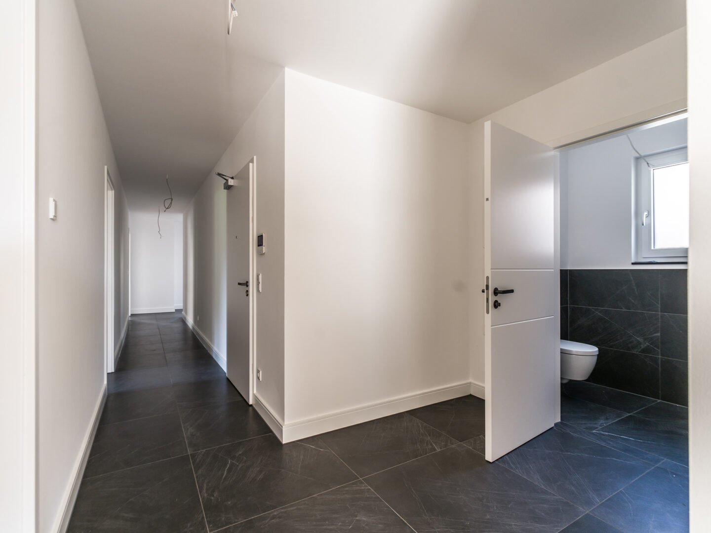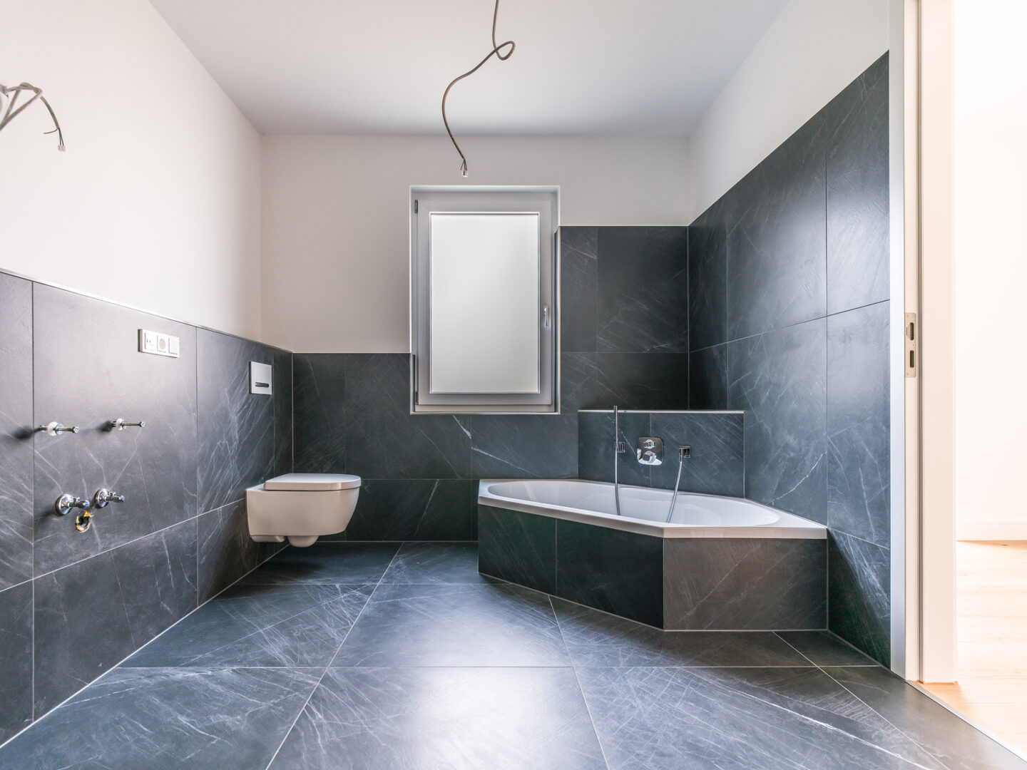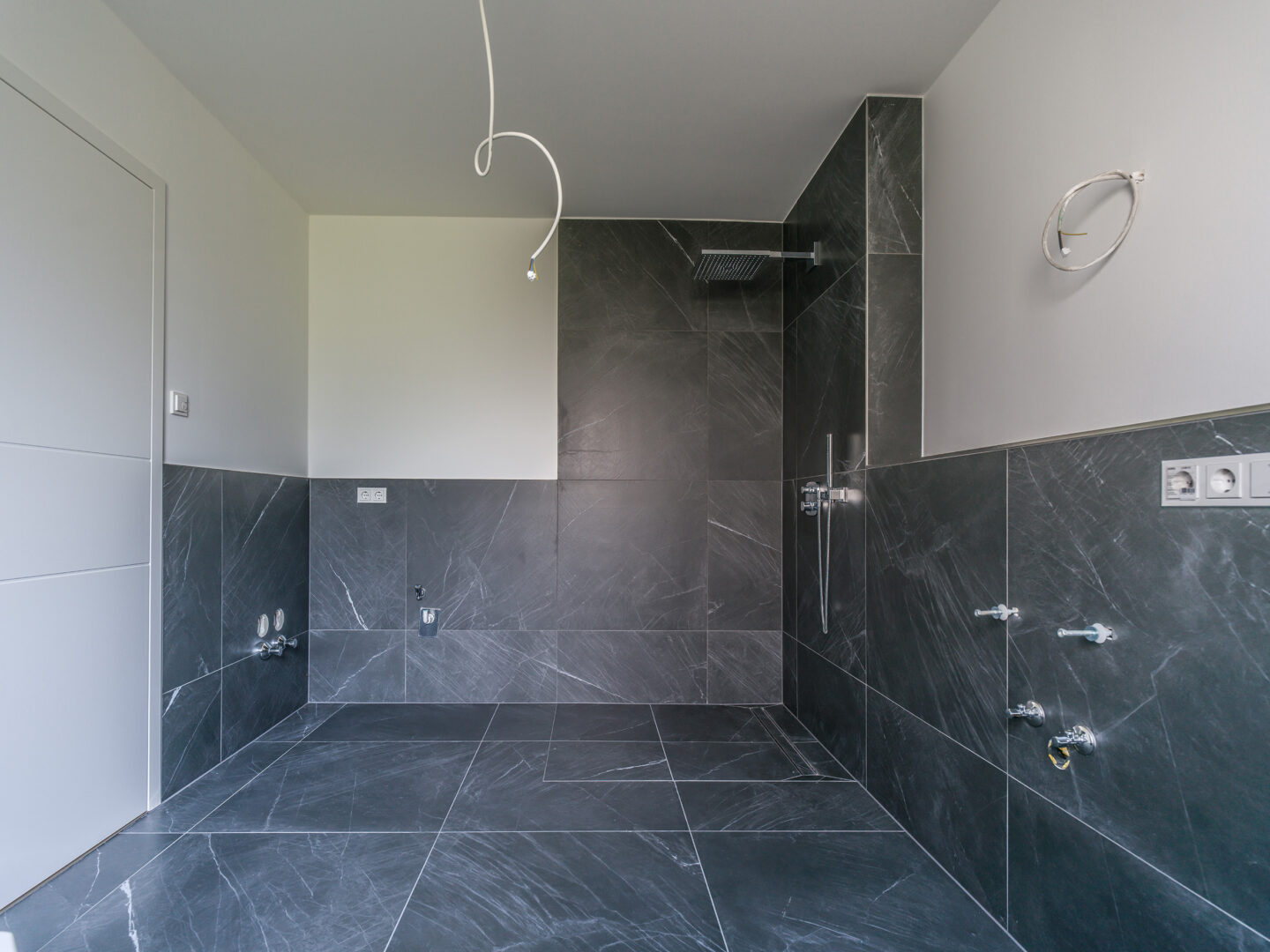 ✅ Exklusive Ausstattung mit schwarzen italienischen Designerfliesen (1,20m x 1,20m) und elegantem Eichenholz-Dielenparkett